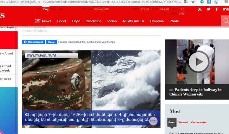 NUHÇIXAN erməni KİV-lərinə istinadla xəbər verir ki, fevralın 7-də saat 17:02 radələrində Zəngəzur vilayətində (Syunik) Ermənistan silahlı qüvvələrinin hərbi hissələrinin birində 4 nəfər müqaviləli əsgər qar uçqunu altında qalıblar. Axtarışlar zamanı onlardan üçünün meyiti tapılıb, biri isə müxtəlif bədən xəsarətləri alıb. Ölənlər sıravi əsgər Karapet Nazaryan, kiçik serjantlar Tiqran Arzumanyan və Nvre Çahbazyandır. Sağ qalan isə sıravi əsgər Hamlet Mirzoyandır.
