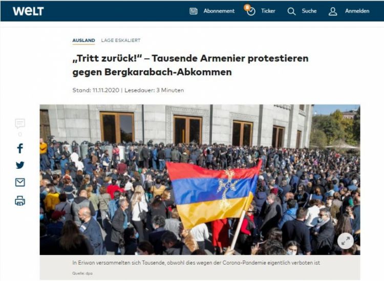 Almaniyanın “Die Welt” qəzetində “Minlərlə erməni Qarabağ razılaşmasına etiraz edir” sərlövhəli məqalə dərc olunub.