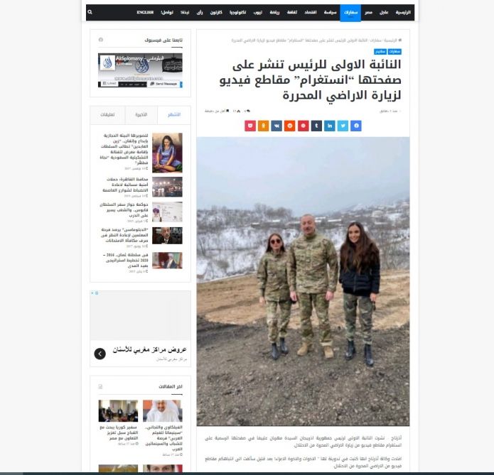 Misirin “Əl Diplomasi” informasiya portalında Azərbaycan Prezidenti İlham Əliyev, birinci xanım Mehriban Əliyeva və qızları Leyla Əliyevanın Füzuli və Xocavənd rayonlarına səfərindən bəhs edən xəbər yerləşdirilib.