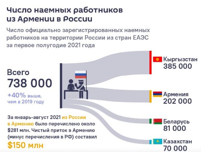 Belə ki, 2021-ci ilin yanvar-iyul aylarında Ermənistandan Rusiyaya 20 min miqrant gəlib. 2021-ci ilin sonunda Rusiyaya miqrant axını son 25 ildə rekord həddə - 398 min nəfərə çata bilər. Sonuncu dəfə 1996-cı ildə Ermənistandan bu ölkəyə gedən miqrantların sayı 400 mini keçib.