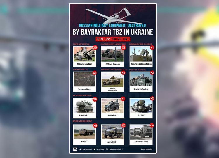 Hesablamalara görə, fevralın 24-dən bəri “Bayraktar” TB2 Ukraynadakı döyüşlərdə Rusiyanın ümumi dəyəri 600 milyon dollar olan texnikalarını məhv edib.
