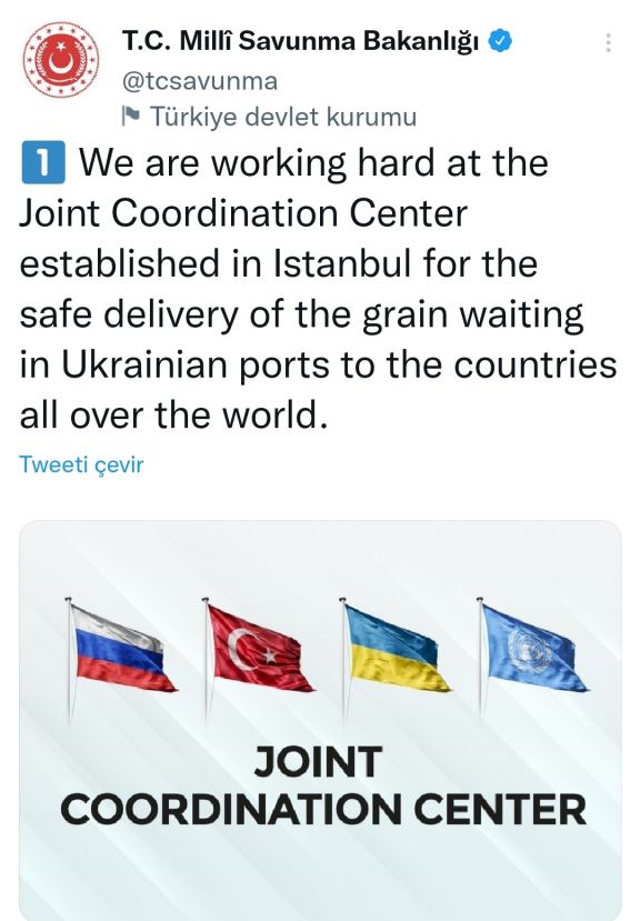 Ukrayna limanlarında gözləyən taxılın dünya ölkələrinə təhlükəsiz daşınması üçün İstanbulda yaradılmış Birgə Koordinasiya Mərkəzində işlər davam edir.