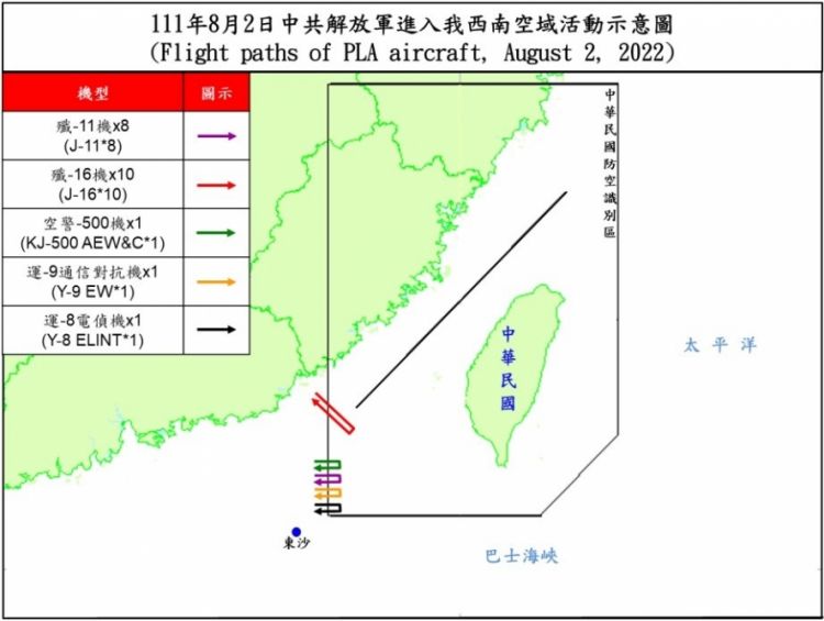 ABŞ Nümayəndələr Palatasının spikeri Nensi Pelosinin rəhbərlik etdiyi heyətin olduğu təyyarə Tayvana yaxınlaşarkən Çin hərbi hava qüvvələrinə məxsus müxtəlif təyinatlı 21 təyyarə Tayvanın hava məkanının tanınma zonasına daxil olub.