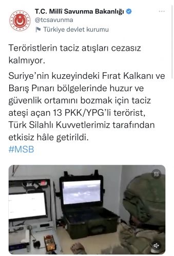 Məlumata əsasən, terrorçular Suriyanın şimalındakı “Fərat qalxanı” və “Sülh çeşməsi” əməliyyatlarının keçirildiyi bölgələrdə zərərsizləşdiriliblər. Bu terrorçuların hücum hazırlığında olduğu və təxribat atəşi açdığı bildirilir.