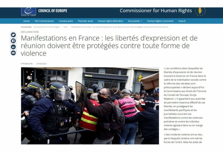 “Fransada pensiya islahatına qarşı sosial səfərbərlik ifadə və sərbəst toplaşma azadlıqlarının həyata keçirildiyi şərait narahatlıq doğurur”, - deyə Avropa Şurasının İnsan hüquqları üzrə komissarı Dunya Miyatoviçin bu ölkədəki vəziyyətlə bağlı narahatlığını əks etdirən bəyanatda bildirilib.