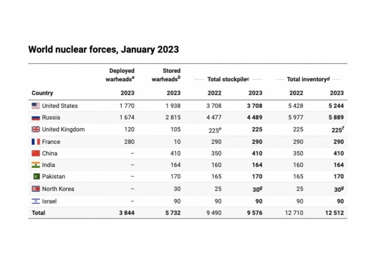 2023-cü ilin yanvar ayına olan məlumata görə, nüvə texnologiyalarına malik ölkələr ümumilikdə 12 512 nüvə başlığına sahibdir. Döyüş başlıqlarının 9576-sı potensial istifadə üçün hərbi ehtiyatlarda saxlanılır. Onların təxminən iki minə qədəri Rusiya və ABŞ arsenalında daimi döyüş hazırlığı vəziyyətindədir.