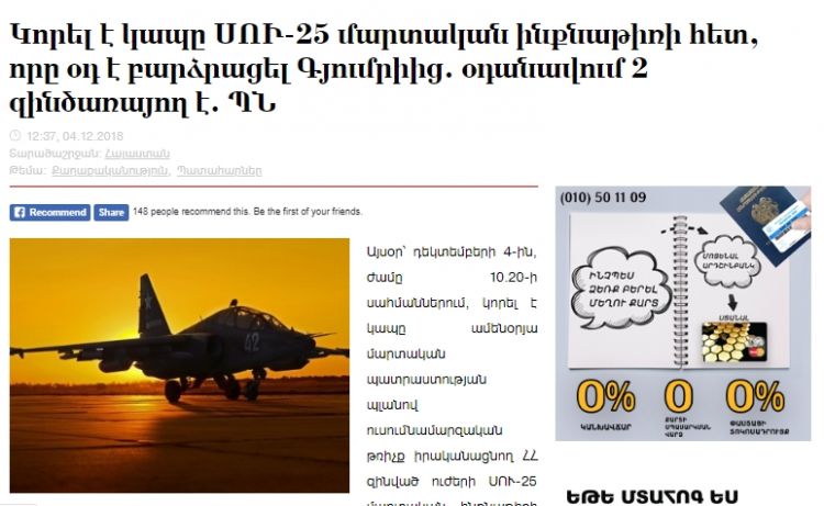 Gümrü şəhərindəki aeroportdan havaya qalxandan sonra radarlardan itən döyüş təyyarəsinin qəzaya uğraması nəticəsində 2 pilot ölüb. Bunlar polkovnik-leytenant Armen Babayan və mayor Movses Manukyandır.