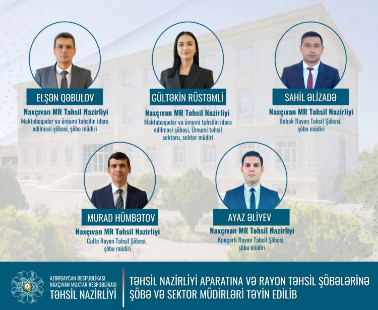 Belə ki, Elşən Tofiq oğlu Qəbulov Təhsil Nazirliyi Aparatının Məktəbəqədər və ümumitəhsilin idarə edilməsi şöbəsinə şöbə müdiri, Gültəkin Əli qızı Rüstəmli həmin şöbəyə sektor müdiri, Sahil Əkbər oğlu Əlizadə Babək rayon Təhsil Şöbəsinə, Murad Rövşən oğlu Hümbətov Culfa rayon Təhsil Şöbəsinə, Ayaz İdris oğlu Əliyev isə Kəngərli rayon Təhsil Şöbəsinə müdir təyin olunublar.