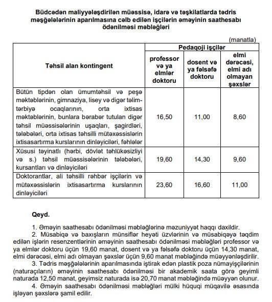 Qərara əsasən, Azərbaycanda pedoqoji işçilərin əməyinin saathesabı ödənilməsinin yeni məbləğləri təsdiq edilib: