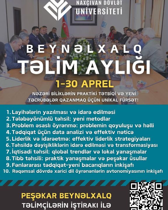NUHÇIXAN xəbər verir ki, nəzəri biliklərin praktiki tətbiqi və yeni təcrübələr qazanmaq üçün Naxçıvan Dövlət Universiteti 2025-ci ilin aprel ayını Beynəlxalq təlimlər aylığı elan edib.