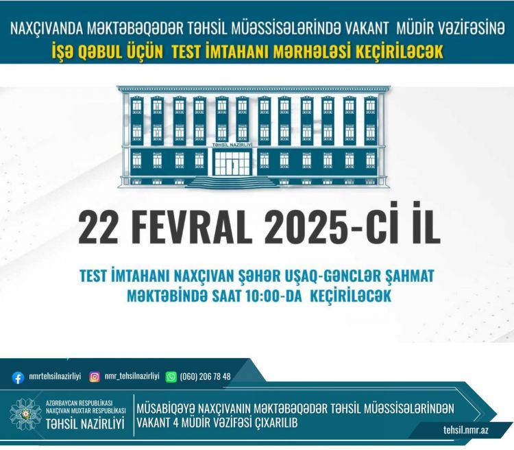 NUHÇIXAN xəbər verir ki, fevralın 22-də Naxçıvanda məktəbəqədər təhsil müəssisələrində vakant olan müdir vəzifəsinə ölkə üzrə mərkəzləşmiş qaydalara uyğun olaraq işə qəbul üçün test imtahanı mərhələsi təşkil olunacaq.