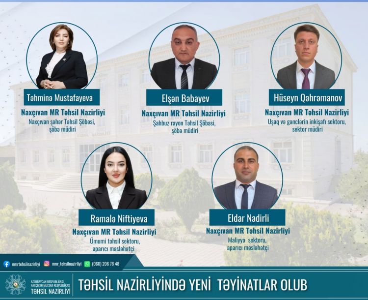 Belə ki,Təhminə Vilayət qızı Mustafayeva Naxçıvan şəhər, Elşən Fəxrəddin oğlu Babayev Şahbuz rayon təhsil şöbələrinə müdir, Hüseyn Qəhraman oğlu Qəhrəmanov Təhsil Nazirliyi Aparatının Uşaq və gənclərin inkişafı sektorunda sektor müdiri, Ramalə Camal qızı Niftiyeva və Eldar Binnət oğlu Nadirli isə Təhsil Nazirliyinin Aparatına aparıcı məsləhətçi vəzifələrinə təyin olunublar.