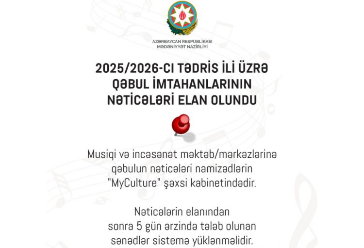 2025/2026-cı tədris ili üzrə musiqi, incəsənət məktəb və mərkəzlərinə qəbul imtahanlarının nəticələri açıqlanıb.