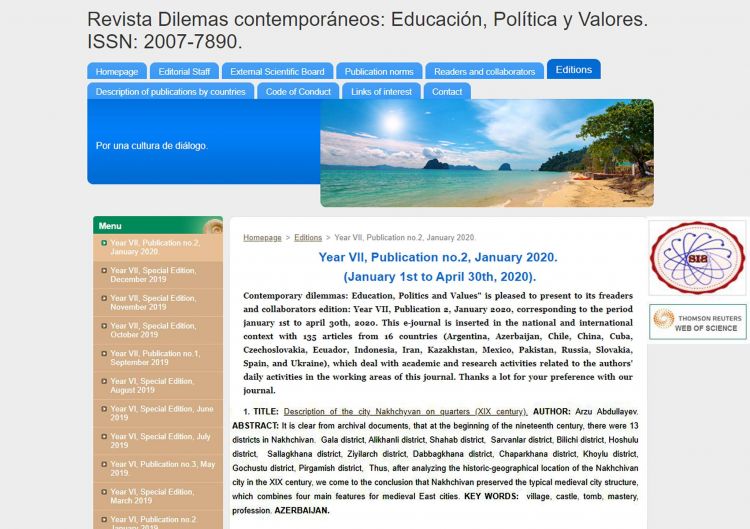 NUHÇIXAN xəbər verir ki, Thomson Reuters Master və Scientific Indexing Services beynəlxalq indekslərinə daxil olan və Meksikada nəşr edilən “Revista Dilemas Contemporaneos: Educacion, Politica y Valores" jurnalının növbəti sayında Naxçıvan Dövlət Universitetinin Beynəlxalq münasibətlər kafedrasının əməkdaşı, gənc tədqiqatçı Arzu Abdullayevin məqaləsi dərc olunub. İngilis dilində dərc olunan və “XIX əsr Naxçıvan şəhərinin məhəllələr üzrə təsviri” adlı məqalədə XIX əsrdə Azərbaycanda mövcud 10 şəhərdən biri olan Naxçıvanda yerləşən məhəllələr, onların hazırda yerləşdiyi ərazilərdən bəhs olunur.