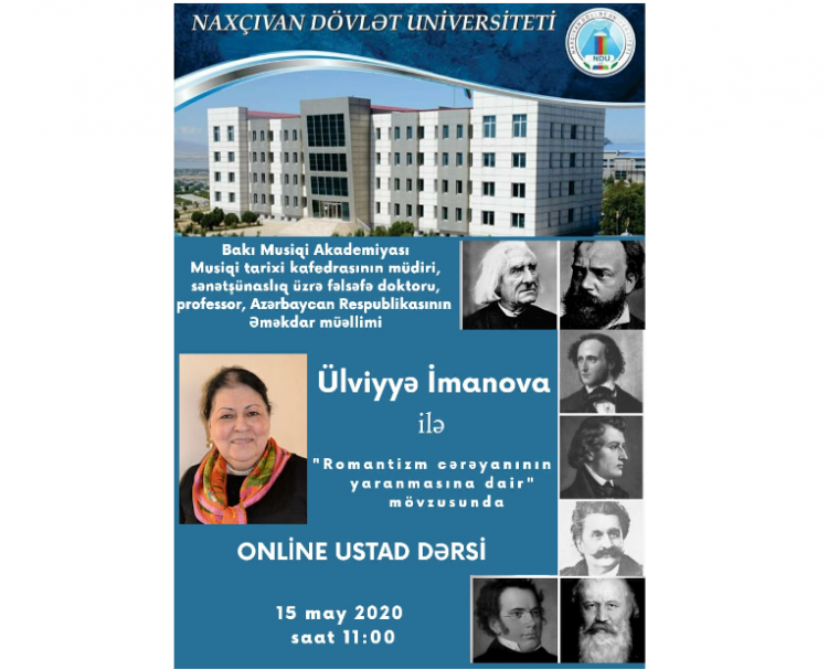 NUHÇIXAN İnformasiya Agentliyi xəbər verir ki, Naxçıvan Dövlət Universiteti Konservatoriyasının müəllim və tələbələri üçün onlayn seminar təşkil edilib. “Romantizm cərəyanının yaranmasına dair” mövzunu Bakı Musiqi Akademiyası Musiqi tarixi kafedrasının müdiri, professor, Azərbaycan Respublikasının Əməkdar müəllimi Ülviyyə İmanova keçib.