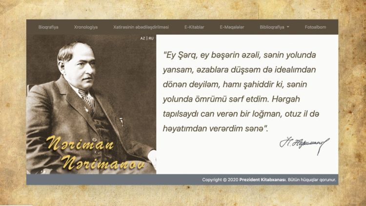 Prezident Kitabxanasından NUHÇIXAN İnformasiya Agentliyinə bildirilib ki, əməkdaşların Azərbaycan və rus dillərində hazırladıqları bu elektron layihə görkəmli yazıçı və dövlət xadimi Nəriman Nərimanovun 150 illik yubileyinin qeyd edilməsi haqqında Azərbaycan Respublikası Prezidentinin 2020-ci il 14 fevral tarixli Sərəncamına əsasən hazırlanan tədbirlər planı çərçivəsində ərsəyə gətirilib.