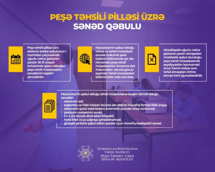 Peşə Təhsili üzrə Dövlət Agentliyindən NUHÇIXAN İnformasiya Agentliyinə bildirilib ki, qeydiyyat avqustun 31-dək davam edəcək. Tələbələr qəbul olunduqları təhsil müəssisəsinə qeyd olunan sənədləri təqdim etməlidirlər: