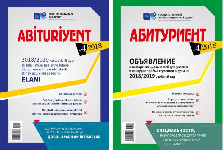 NUHÇIXAN xəbər verir ki, jurnalın bu nömrəsində 2018/2019-cu tədris ili üçün Azərbaycan Respublikasının ali təhsil müəssisələrinə tələbə qəbulu müsabiqəsində iştirak məqsədilə ixtisas seçimi elanı, “Abituriyentin elektron ixtisas seçimi ərizəsi”nin doldurulma qaydası, ali təhsil müəssisələrinə qəbul aparılan ixtisaslar, dövlət sifarişi ilə tələbə qəbulunun proqnozu dərc edilib. Bu nömrədə, həmçinin Türkiyə Respublikası Daxili İşlər Nazirliyinin Jandarma Baş Komandanlığının Jandarma və Sahil Təhlükəsizlik Akademiyasına 2018/2019-cu tədris ili üçün kursant qəbulu qaydaları və digər zəruri materiallar təqdim olunub.