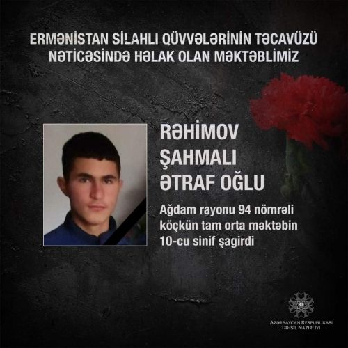 Təhsil Nazirliyindən NUHÇIXAN İnformasiya Agentliyinə bildirilib ki, 16 yaşlı Şahmalı Rəhimov Ermənistan silahlı qüvvələri tərəfindən Bərdə rayonuna atılan mərmi nəticəsində həlak olub. O, Ağdam rayonu 94 nömrəli köçkün tam orta məktəbin 10-cu sinif şagirdi idi.