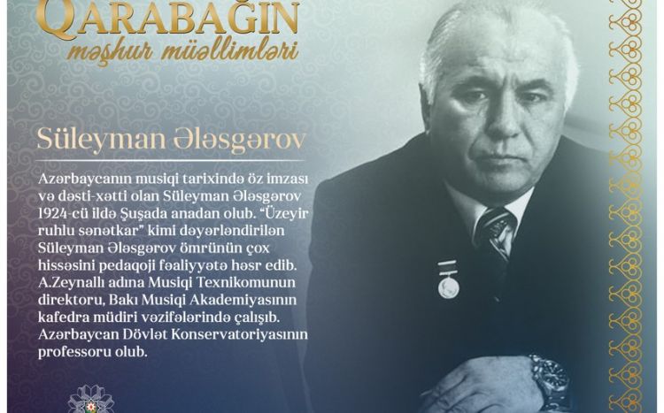Təhsil Nazirliyinin "Qarabağın məşhur müəllimləri" layihəsinin növbəti siması görkəmli bəstəkar, pedaqoq, respublikanın xalq artisti Süleyman Ələsgərovdur.