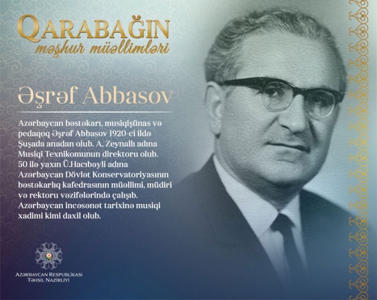 Görkəmli bəstəkar, musiqişünas, pedaqoq, professor, Xalq artisti Əşrəf Abbasov Azərbaycan incəsənət tarixinə unudulmaz musiqi xadimi kimi daxil olub, müxtəlif janrlarda maraqlı əsərlər yaradıb.