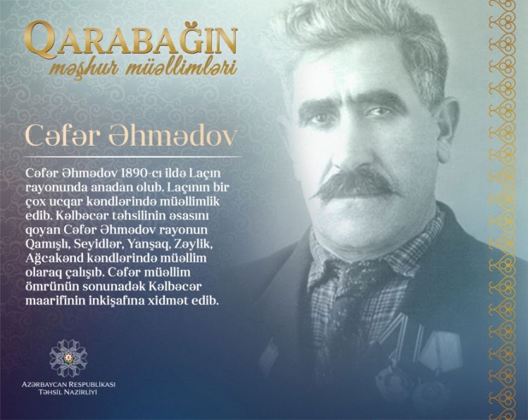 Nazirlikdən NUHÇIXAN İnformasiya Agentliyinə bildirilib ki, layihənin növbəti tarixi siması Kəlbəcərdə təhsilin əsasını qoyanlardan biri, istedadlı pedaqoq Cəfər Əhmədovdur. O, 1890-cı ilin aprel ayında Laçının Minkənd kəndində anadan olub. Minkənd 2 illik rus-tatar məktəbini, Gorus gimnaziyasını başa vurduqdan sonra Laçının bir çox ucqar kəndlərində müəllimlik edib. Daha sonra Kəlbəcərin Qamışlı, Seyidlər, Yanşaq, Zəylik, Ağcakənd kəndlərində müəllim olaraq çalışıb. Hər kəsə “Bala, gələcəyiniz yalnız elmdə, təhsildədir”,- deyən Cəfər müəllim ömrünün sonunadək Kəlbəcər maarifinin inkişafına xidmət edib.