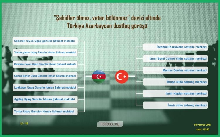 Bu barədə Naxçıvan Muxtar Respublikası Təhsil Nazirliyinin mətbuat xidmətindən NUHÇIXAN İnformasiya Agentliyinə məlumat verilib. “Şəhidlər ölməz, vətən bölünməz” devizi altında keçiriləcək görüş Şahmat Federasiyasının Sədərək Rayon Bölməsi, Sədərək Rayon Təhsil Şöbəsi, Sədərək Rayon Uşaq Gənclər Şahmat Məktəbi, Yevlax Şəhər Uşaq Gənclər İdman Şahmat Məktəbi və İzmir Deha Satranc Mərkəzinin birgə təşkilatçılığı ilə baş tutacaq. 12 komanda arasında keçiriləcək yoldaşlıq görüşündə 16 yaş qrupundan 144 müxtəlif dərəcəli şahmatçı şagirdin iştirakı nəzərdə tutulub. 16 yanvar 2021-ci il tarixdə saat 18:00-da Lichess.org platforması vasitəsilə keçiriləcək görüşün yekun nəticələri Naxçıvan Şahmat Federasiyasının və Naxçıvan Muxtar Respublikası Təhsil Nazirliyinin rəsmi internet saytlarında elan ediləcəkdir.