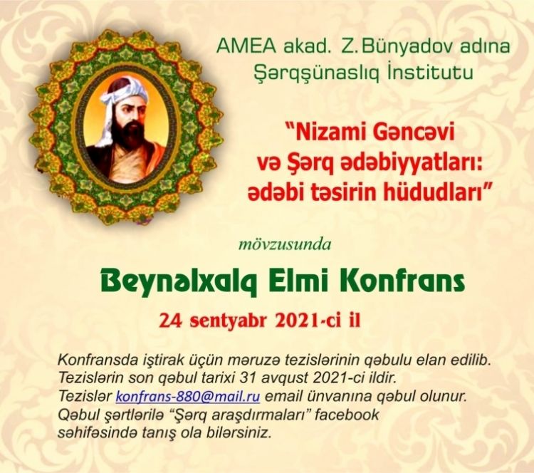 “Nizami Gəncəvi İli” çərçivəsində akademik Ziya Bünyadov adına Şərqşünaslıq İnstitutu tərəfindən sentyabrın 24-də “Nizami Gəncəvi və Şərq ədəbiyyatları: ədəbi təsirin hüdudları” mövzusunda beynəlxalq elmi konfrans keçiriləcək.