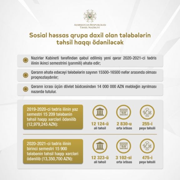 Təhsil Nazirliyindən NUHÇIXAN İnformasiya Agentliyinə bildirilib ki, qərara əsasən, 2020-2021-ci tədris ilinin ikinci yarımili sosial baxımdan həssas əhali qrupuna aid edilən tələbələrin təhsil haqqı xərcləri dövlət büdcəsi hesabına ödəniləcək. Bu tələbələrin sayının 15 min 500 – 16 min 500 nəfər arasında olması proqnozlaşdırılır. Bu məqsədlə dövlət büdcəsindən 14 milyon manat ayrılması nəzərdə tutulur.