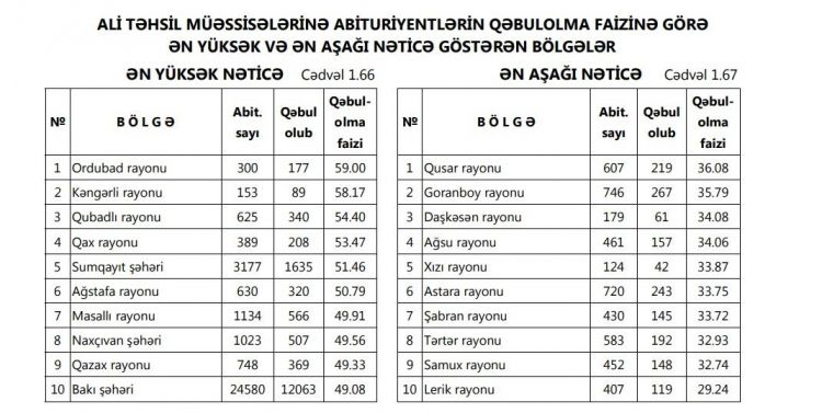 Ötən tədris ilində ali təhsil müəssisələrinə abituriyentlərin qəbulolma faizinə görə ən yüksək və ən aşağı nəticə göstərən bölgələrin adları məlum olub.