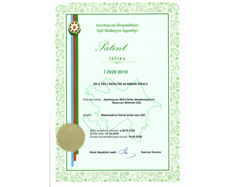 AMEA Naxçıvan Bölməsi Təbii Ehtiyatlar İnstitutunun Sorbsiya prosesləri laboratoriyasının rəhbəri, kimya üzrə fəlsəfə doktoru, dosent Günel Məmmədova “ZK-4 tipli seolitin alınması üsulu” adlı ixtirasına görə Azərbaycan Respublikası Əqli Mülkiyyət Agentliyindən patent alıb.