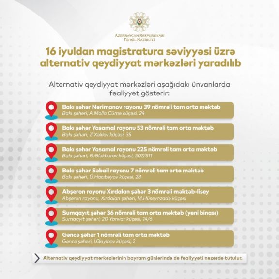 Qeyd edək ki, magistratura səviyyəsi üzrə elektron qeydiyyat prosesinə dəstək olmaq üçün yaradılmış alternativ qeydiyyat mərkəzləri bu şənbə - iyulun 24-də fəaliyyət göstərir. Mərkəzlər iyulun 25-də fəaliyyət göstərməyəcək.