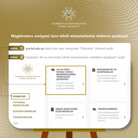 Müraciət üçün portal.edu.az-da qeydiyyatdan keçmək, yaradılan kabinetə daxil olduqdan sonra “Ali və orta ixtisas təhsil müəssisələrinə təhsilalan qeydiyyatı” xidmətini seçmək lazımdır. Açılan səhifədə müvafiq qəbul xətti üzrə şəxsi məlumatların və qəbul məlumatlarının daxil edilməsi, sosial güzəşt üçün məlumatların təqdim edilməsi və təhsil haqqının icra edilməsi mümkün olur.