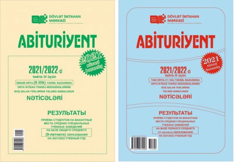 Dövlət İmtahan Mərkəzi (DİM) 2021/2022-ci tədris ili üçün ümumi (9 illik) və tam (11 illik) orta təhsil bazasında orta ixtisas təhsili müəssisələrinin boş qalan yerlərinə tələbə qəbulunun nəticələrini elektron formada “Abituriyent” jurnalının iki xüsusi buraxılışında dərc edib.