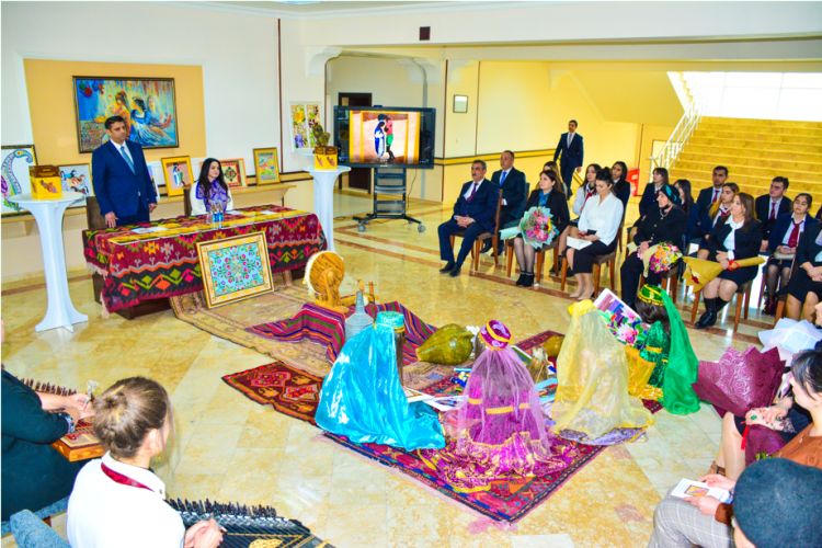 Sonda milli üslubda tərtib olunan təqdimat zalında tələbələrin miniatür kompozisiyalı, milli-tikmə sənəti nümunələrindən ibarət 30-dan artıq əl işi sərgilənib.