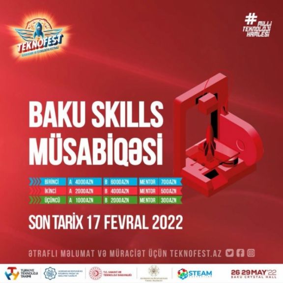 “Teknofest Azərbaycan” tədbiri çərçivəsində keçirilən “Baku Skills” kateqoriyası üzrə müsabiqə Azərbaycan Respublikası Təhsil Nazirliyi və Təhsil İnstitutunun dəstəyi ilə “STEAM Azərbaycan” layihəsi tərəfindən təşkil olunur.