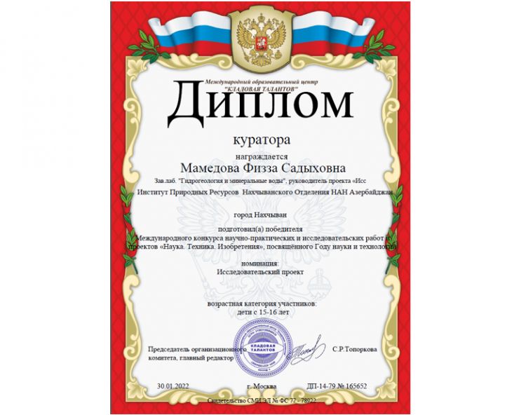 AMEA Naxçıvan Bölməsinin mətbuat xidmətindən NUHÇIXAN İnformasiya Agentliyinə bildirilib ki, Bölmənin Təbii Ehtiyatlar İnstitutunun Hidrogeologiya və mineral sular laboratoriyasının müdiri, kimya üzrə fəlsəfə doktoru, dosent Fizzə Məmmədovanın rəhbərliyi ilə hazırda 4 məktəbli iki layihə üzrə araşdırmalara davam edir. Naxçıvan Qızlar Liseyinin XI sinif şagirdi Nuray Məmmədova, 3 №-li tam orta məktəbin X sinif şagirdi Fərid Cabbarov, 14 №-li tam orta məktəbin X sinif şagirdi Ramiz Səfərli və 7 №-li tam orta məktəbin X sinif şagirdi Türkan Zülfüqarlının “Naxçıvan Muxtar Respublikasının təbii su mənbələri” adlı məqaləsi Rusiya Təbiətşünaslıq Akademiyasının nəşri olan “Международный школьный научный вестник” (Beynəlxalq məktəb elmi xəbərləri) jurnalında dərc olunub, jurnalın rəsmi internet səhifəsində yerləşdirilib. Məqalə müəllifləri və elmi rəhbər Fizzə Məmmədova sertifikat və diploma layiq görülüblər.