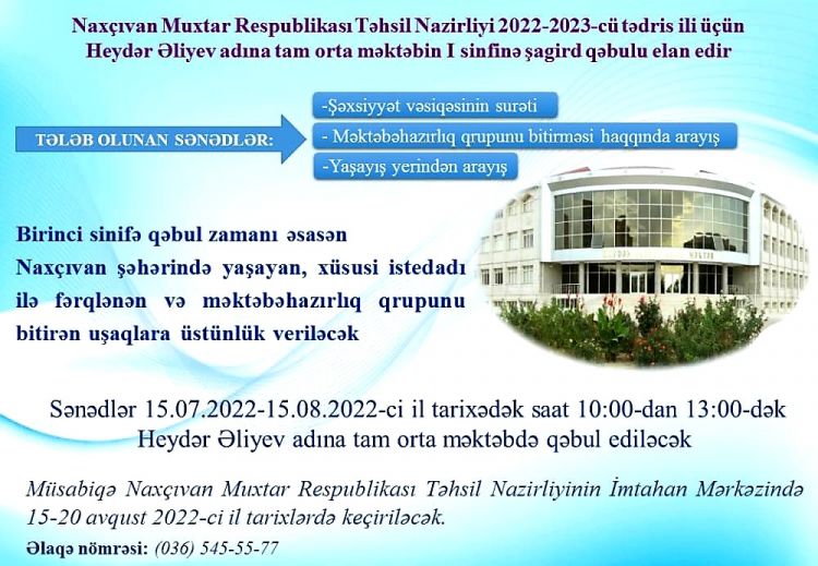 Sənədlər 15 iyul 2022-ci il tarixdən 15 avqust 2022-ci il tarixədək saat 10:00-dan 13:00-dək Heydər Əliyev adına tam orta məktəbdə qəbul ediləcək. Müsabiqə 15-20 avqust 2022-ci il tarixlərində Naxçıvan Muxtar Respublikası Təhsil Nazirliyinin İmtahan Mərkəzində keçiriləcək. Müsabiqə zamanı uşaqlara məktəbəhazırlıq proqramı üzrə ətraf aləmlə tanışlıq, savad təliminə hazırlıq və nitqin inkişafı, bədii, məntiqi və riyazi təfəkkürün inkişafı, təsviri fəaliyyət fənləri üzrə suallar veriləcək. Məktəbin I sinfinə 120 şagird qəbul olunacaq. Şagirdlərin qəbulunda şəffaflığı təmin etmək üçün müşahidə kameraları vasitəsilə çəkiliş də aparılacaq.