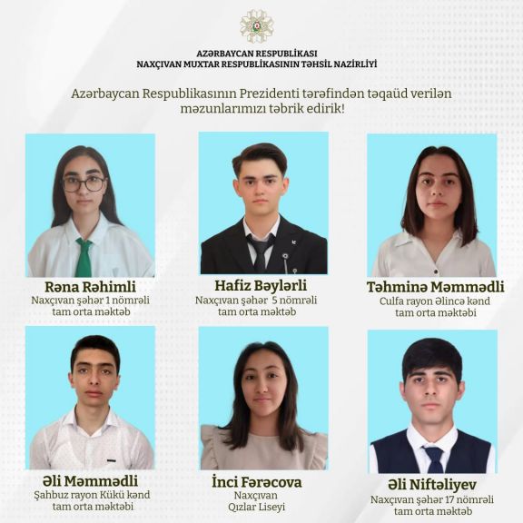 NUHÇIXAN xəbər verir ki, Sərəncama əsasən, 2023–2024-cü tədris ilində tələbə qəbulu imtahanlarında ixtisas qrupları üzrə ən yüksək nəticələr göstərmiş və Azərbaycan Respublikasının ali məktəblərinə daxil olmuş Naxçıvandan olan 6 tələbəyə Prezident təqaüdü verilib.