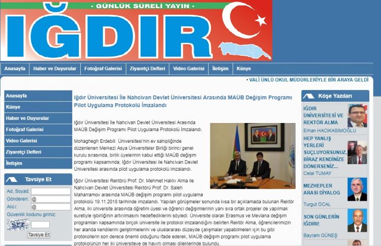 NUHÇIXAN xəbər verir ki, Türkiyənin “İğdır” qəzetində İğdır Universiteti ilə Naxçıvan Dövlət Universiteti arasında əlaqələri əks etdirən yazı verilib. Yazıda bildirilir ki, Mərkəzi Asiya Universitetlər Birliyinin əsas heyət üzvlərinin qəbul etdiyi MAÜB mübadilə proqramı çərçivəsində İğdır Universiteti və Naxçıvan Dövlət Universiteti arasında pilot protokolu imzalanıb.