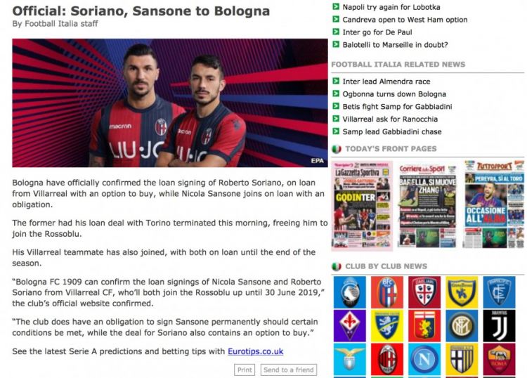“Vilyareal”ın italiyalı hücumçusu Nikola Sansone və komanda yoldaşı, yarımmüdafiəçi Roberto Soriano 6 ay müddətində icarə əsasında “Bolonya”da çıxış edəcək.