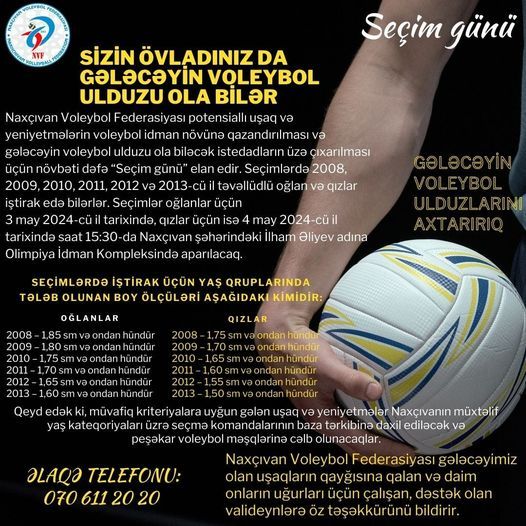 NUHÇIXAN xəbər verir ki, Naxçıvan Voleybol Federasiyası potensiallı uşaq və yeniyetmələrin voleybol idman növünə qazandırılması və gələcəyin voleybol ulduzu ola biləcək istedadların üzə çıxarılması üçün növbəti dəfə “Seçim günü” elan edir. Seçimlərdə 2008, 2009, 2010, 2011, 2012 və 2013-cü il təvəllüdlü oğlan və qızlar iştirak edə bilərlər. Seçimlər oğlanlar üçün 3 may 2024-cü il tarixində, qızlar üçün isə 4 may 2024-cü il tarixində saat 15:30-da Naxçıvan şəhərindəki İlham Əliyev adına Olimpiya İdman Kompleksində aparılacaq.