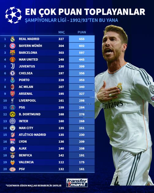 NUHÇIXAN xəbər verir ki, “transfermarkt” portalının tərtib etdiyi siyahıya İspaniyanın “Real Madrid” komandası başçılıq edir. “Kral klubu”nun aktivində 655 xal var.