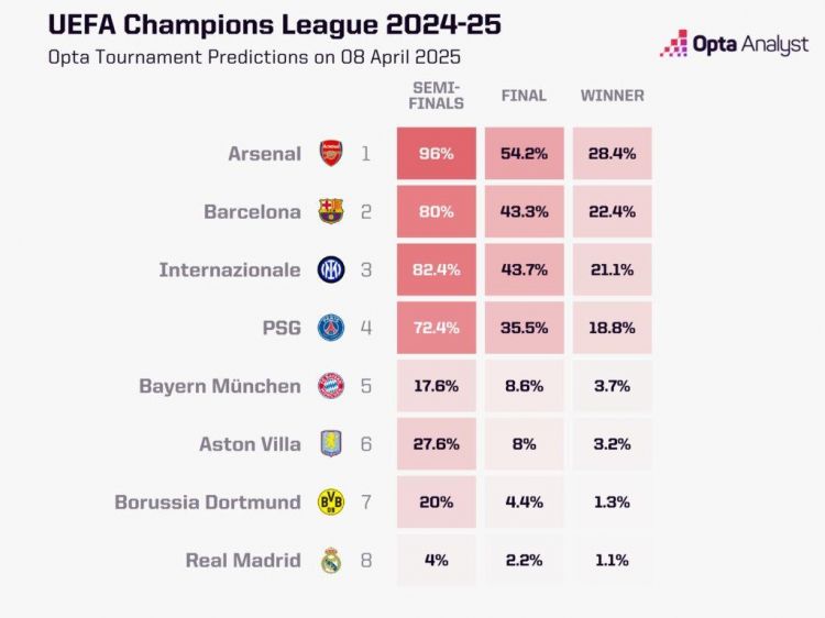“Arsenal” hazırda favorit hesab olunur, kuboku qazanmaq şansı 28,4 % təşkil edir. Mikel Artetanın komandası indi simulyasiyaların yarısından çoxunda (54,2 %) finala çıxır”, – deyə şirkət yenilənmiş proqnozlarını şərh edib.