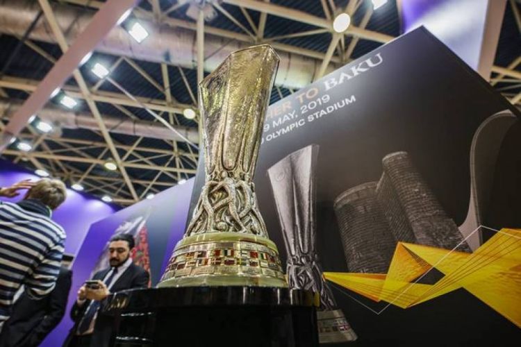 UEFA Avropa Liqasının kubokunun nümayiş etdirildiyi sərgidə iştirakçılara final oyunu ilə bağlı məlumatlar təqdim olunur.