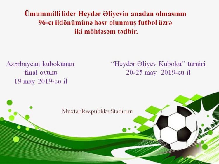 Muxtar respublikamızda futbol bayramı bununla başa çatmır. Ənənəvi olaraq keçirilən futbol üzrə “Heydər Əliyev kuboku” turniri də dördüncü dəfə təşkil olunacaq. “Şüvəlan”, MOİK, “Araz-Naxçıvan” və Türkiyənin “Ağrıspor” komandalarının mübarizə aparacağı turnir dairəvi sistem üzrə keçiriləcək. Oyunlara may ayının 20-də start veriləcək. İlk oyun günündə saat 11:00-da “Araz-Naxçıvan” MOİK-lə, 17:30-da “Şüvəlan” “Ağrıspor”la qarşılaşacaq. Növbəti gündə də oyunların başlama saatı eyni vaxtda olacaq. May ayının 22-də istirahət edəcək komandalar meydana ayın 23-də çıxacaqlar. Eyni zamanda həmin gün saat 17:00-da turnirin bağlanış mərasimi keçiriləcək.