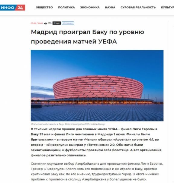 Dünya KİV-ləri Bakıda Avropa Liqasının və Madriddə Çempionlar Liqasının final matçları haqqında materialların dərcini davam etdirirlər. Mayın 3-də Rusiyanın “İnfo24” portalında “Madrid UEFA matçlarının keçirilməsi səviyyəsinə görə Bakıya uduzub” sərlövhəli məqalə yerləşdirilib. NUHÇIXAN həmin məqaləni təqdim edir.