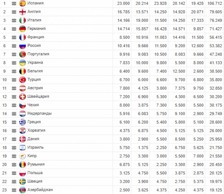 NUHÇIXAN UEFA.com saytına istinadla xəbər verir ki, finalda “Liverpool” komandasına 3:1 hesabı ilə qalib qələn “Real Madrid” İspaniyanın xal hesabını 106.712 çatdıraraq siyahıya başçılıq edir. İngiltərə ikinci, İtaliya üçüncü, Almaniya dördüncü, Fransa isə ilk “beşlik”də qərarlaşıblar.
