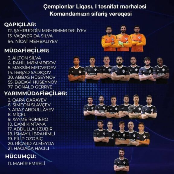 Siyahıya qapıçılardan Şahruddin Məhəmmədəliyev, Vaqner da Silva və Nicat Mehbalıyevin adları salınıb. Müdafiəçilərdən Ailton Silva, Rahil Məmmədov, Maksim Medveyev, Rəşad Sadıqov, Abbas Hüseynov, Bədavi Hüseynov və Donald Geryenin adları siyahıya daxil edilib. Yarımmüdafiəçilərdən Qara Qarayev, Simeon Slavçev, Araz Abdullayev, Miçel, Xayme Romero, Dani Kintana, Abdullah Zubir, İsmayıl İbrahimli, Filip Ozobiç, Riçard Almeyda, Hacıağa Hacılının adlarının yer aldığı siyahıda hücumçu mövqeyində təkcə Mahir Emreli qeyd olunub.
