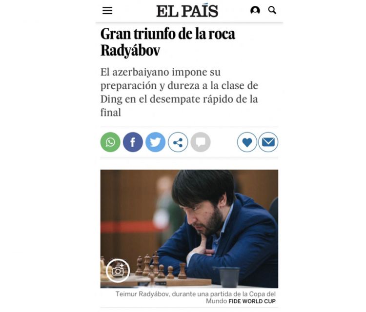 İspaniyada çıxan “El Pais” qəzetində azərbaycanlı qrossmeyster Teymur Rəcəbovun Xantı-Mansiyskdə şahmat üzrə dünya kuboku yarışlarında parlaq qələbəsi haqda “Nəhəng Rəcəbovun böyük zəfəri” sərlövhəli məqalə dərc edilib.